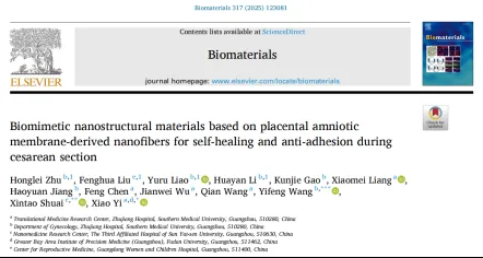 南方医科大学珠江医院王沂峰教授、易笑教授团队牵头,联合中山大学附属第三医院帅心涛教授团队,于 2025 年 1 月 8 日在国际权威期刊《Biomaterials》(IF=12.9)发表了题为 “Biomimetic Nanostructural materials based on placental amniotic membrane-derived nanofibers for self-healing and anti-adhesion during cesarean section” 的研究性论文。
